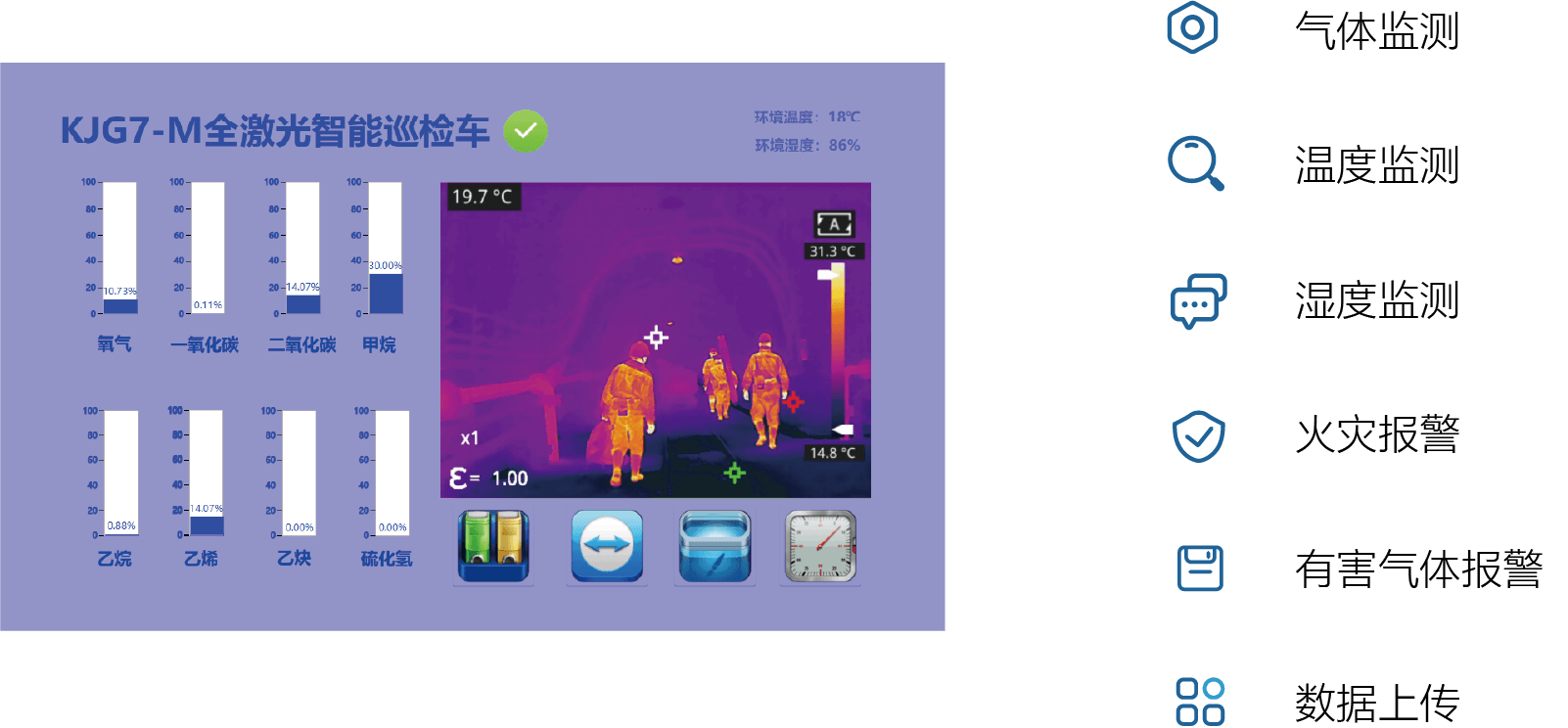 全激光智能巡檢車(chē),是基于華光公司核心技術(shù)----中紅外QCL激光光譜分析技術(shù)為煤礦定制開(kāi)發(fā)的一款產(chǎn)品,可以對(duì)井下火災(zāi)報(bào)警要求的7種氣體巡航實(shí)時(shí)監(jiān)測(cè),是煤礦火災(zāi)預(yù)防預(yù)報(bào)的新一代解決方案。