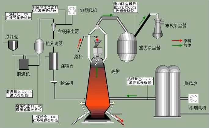 高爐煤氣是高爐煉鐵過(guò)程中所得到的一種副產(chǎn)品,其主要成分CO,?CO2?,?N2?,?H2?,CH4等,?屬于重要的二次能源。 針對(duì)噴煤中煙煤的易揮發(fā)性、強(qiáng)爆炸性,國(guó)惠激光氣體分析儀可在線實(shí)時(shí)監(jiān)測(cè)高爐爐氣中的多氣體組分,指導(dǎo)高爐安全生產(chǎn),優(yōu)化工藝,降低生產(chǎn)成本;?